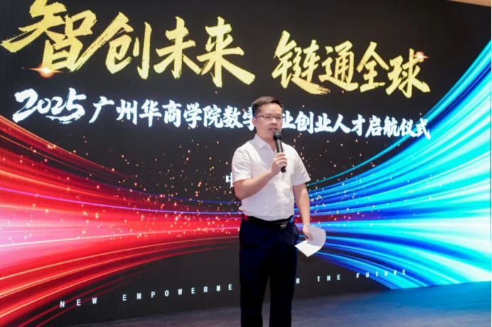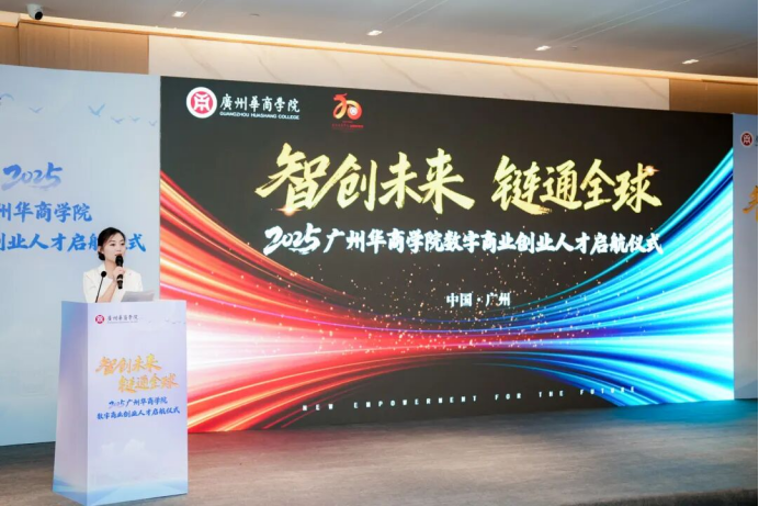 10月12日,智创未来·链通全球——2025广州华商学院数字商业创业人才启航仪式在广州校区弘美楼隆重举行。本次活动是学校深化创新创业教育改革、服务数字经济发展的重要举措,旨在培养具备家国情怀、国际视野、数字思维与实干精神的未来商业领袖。学校领导、行业嘉宾、企业代表、创业导师及2025级电子商务与跨境电子商务创业实验班全体新生共同见证这一重要时刻。“创业新星,启航计划”开班盛典由数字经贸学院曹维老师主持。
