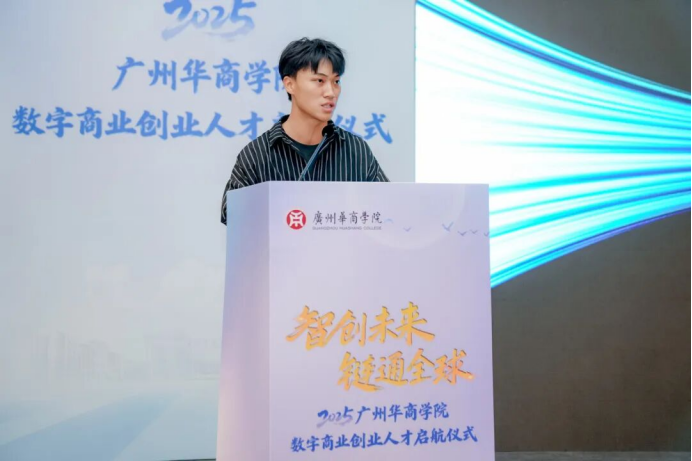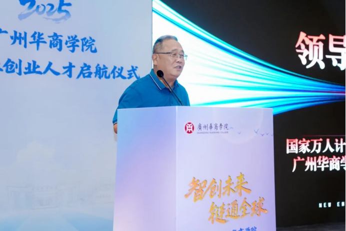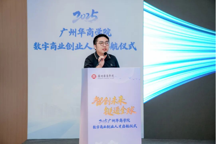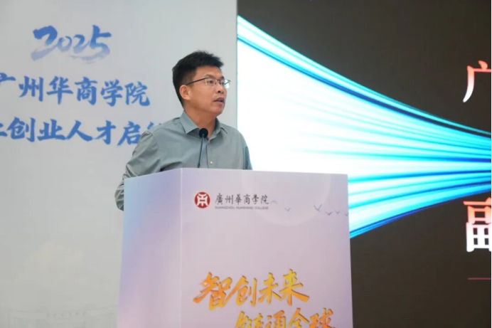 广州华商学院副校长余家军致辞。他表示,在当前数字经济蓬勃发展的时代背景下,学校通过引入行业优质资源,为学生搭建真实创业场景,助力学生在实干中淬炼能力、在创新中实现突破,这是推动专业教育与创新创业教育深度融合的重要实践。他对新生提出三点期望:一要立鸿鹄之志,存报国之心。将个人理想熔铸于国家社会经济发展之中,以赤子之心服务社会,以创新价值贡献寰球;二要博观而约取,厚积而薄发。主动寻求跨领域的知识融通和国际化的视野拓展,注重培养批判性思维与创新创业意识;三要格物以致知,躬行以实践。主动向产业前沿求索,将求知欲化为行动力,在实干中淬炼能力,在创业中收获突破。