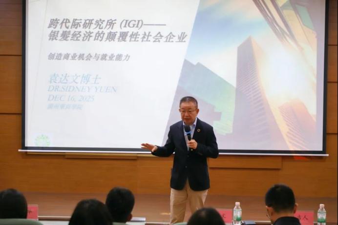 2025年12月16日,由广州华商学院主办,广州华商学院创新创业学院、国际交流与合作处、学生就业创业处承办,粤港澳大湾区青年职业发展促进会、粤港澳大湾区智慧健康养老产业研究中心、银发经济研究院、华商众创孵化基地协办的《银发族与青年共创新机遇》专题讲座在广州校区图书馆一楼学术报告厅顺利举行。